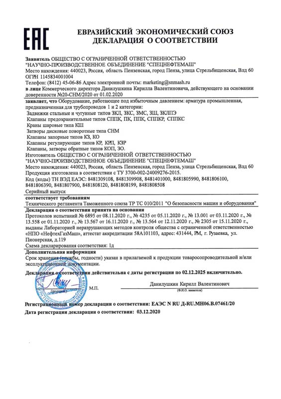 Декларация о соответствии ТР ТС 010/2011. Арматура
